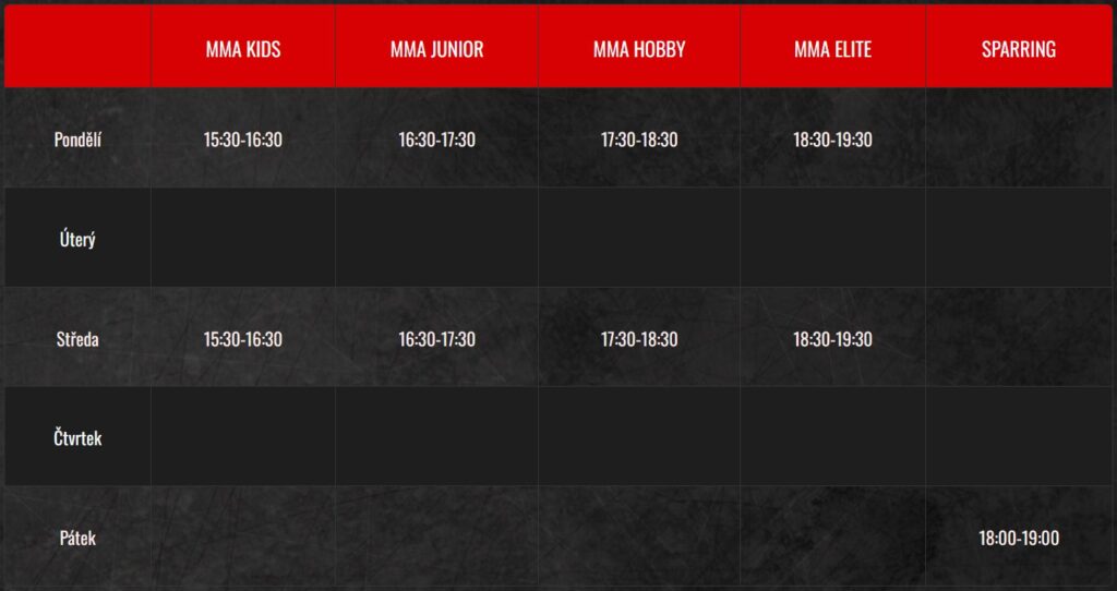 Trénink je přizpůsoben pro úplné začátečníky, bez jakékoli předešlé bojové přípravy a stejně tak, připravíme kvalitní trénink pro aktivní bojovníky. Není povinností účastnit se zápasů, ale pokud jsou Vaše cíle vyšší, tak Vám umožníme vstoupit do octagonu, kde s pomocí našich trenérů můžete vybojovat nejeden zápas.
